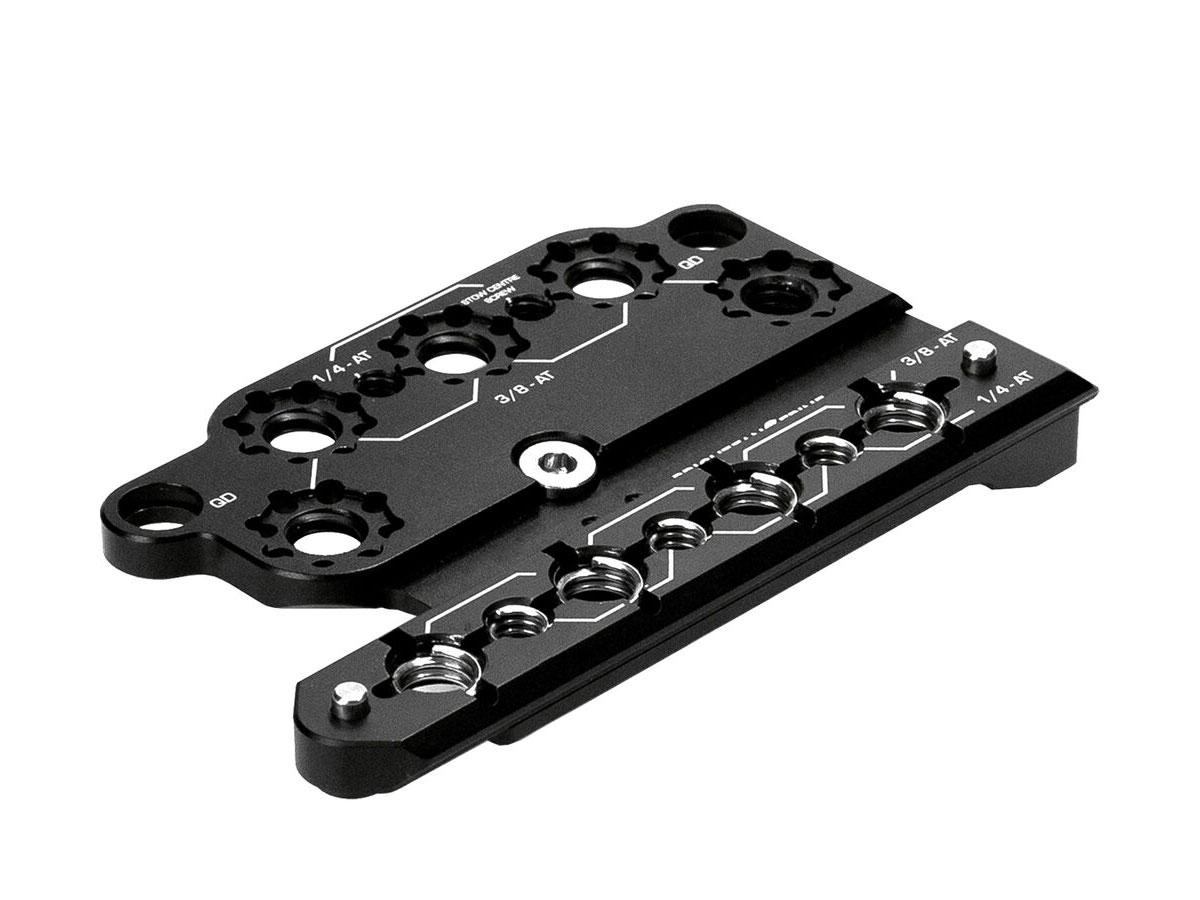 The top plate provides mounting threads for the optional LeftField Side Plate for Canon C70. Multiple 1/4"-20 and 3/8"-16 ARRI-style anti-twist threads as well as an integrated NATO rail are provided for top-mounting a variety of accessories. It features two Quick-Detach (QD) holes for attaching a camera strap or tether.
