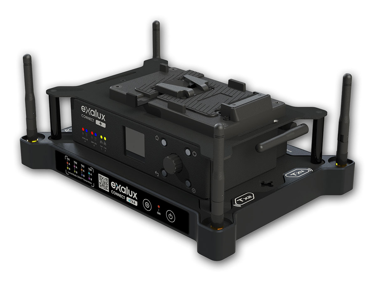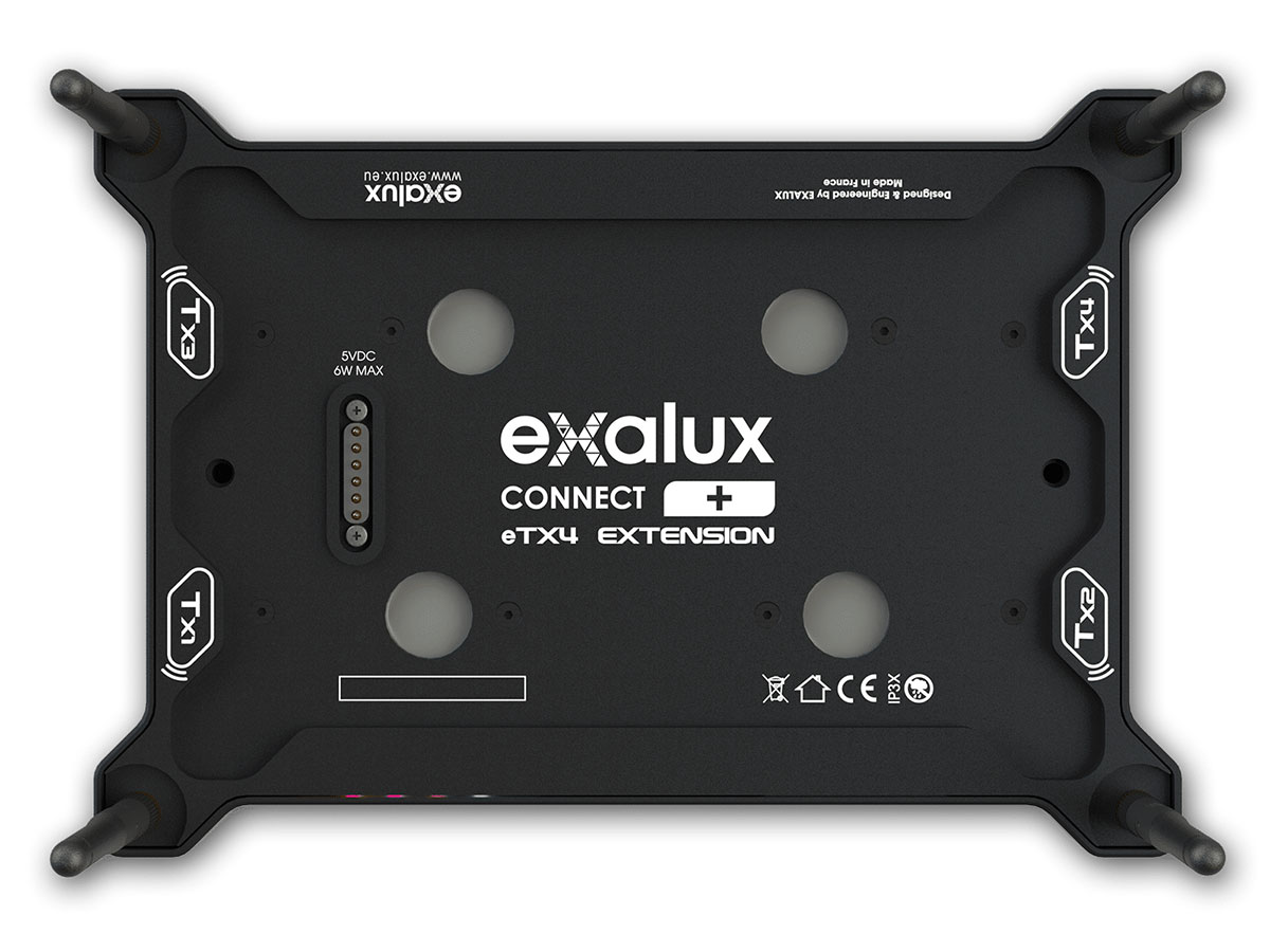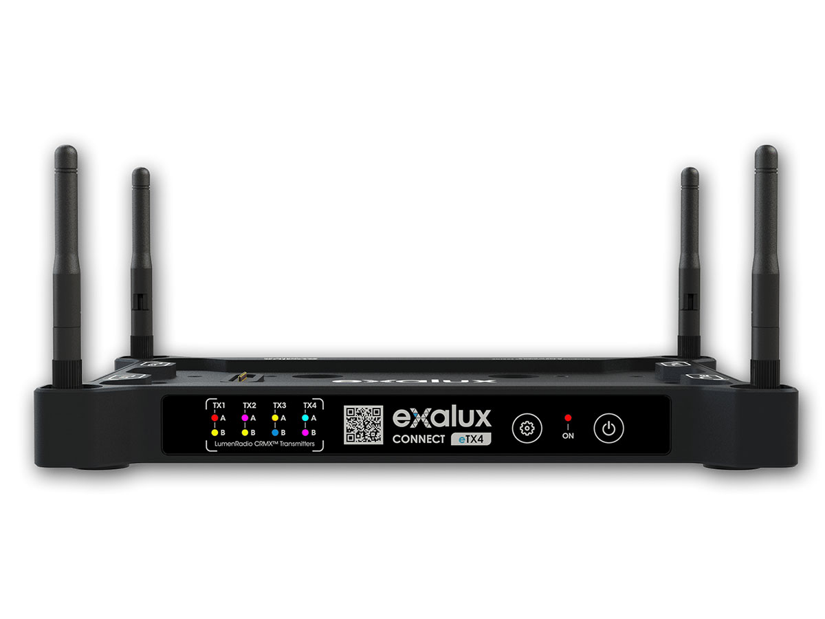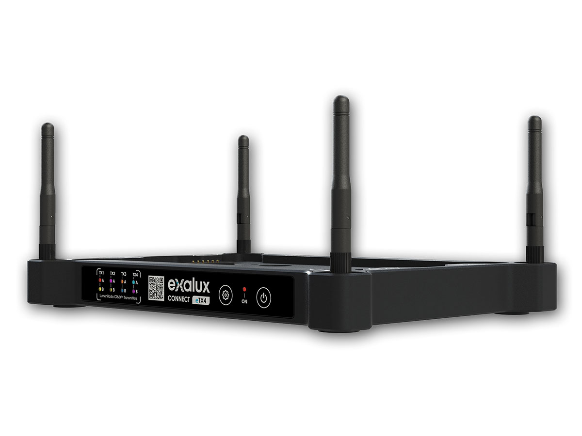 EXALUX™ CONNECT eTX4 is an add-on wireless DMX/RDM transmitter for CONNECT+. It features 4 CRMX/CRMX² transmitters in an ultra compact unit.
