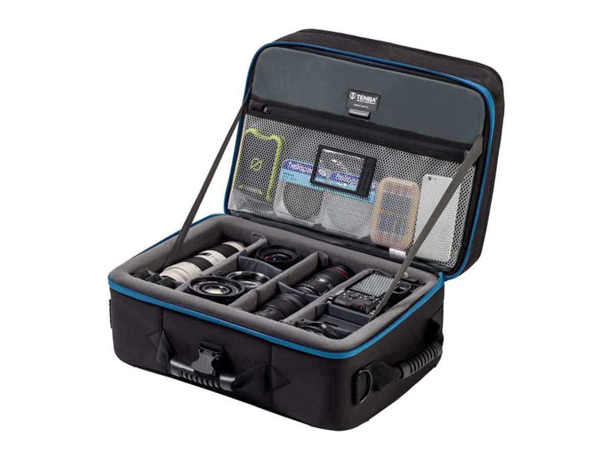 Photographers wishing to up their travel game will appreciate the black Transport Air Case Attache 1914 from Tenba. The case has a zippered, spacious main compartment with touch-fastening dividers for storing and organizing a DSLR, up to 6 lenses, flash, and related accessories. Under the lid is a clear-mesh, zip pocket for cables, cards, batteries, and more. The lid is tethered for easy access to gear.